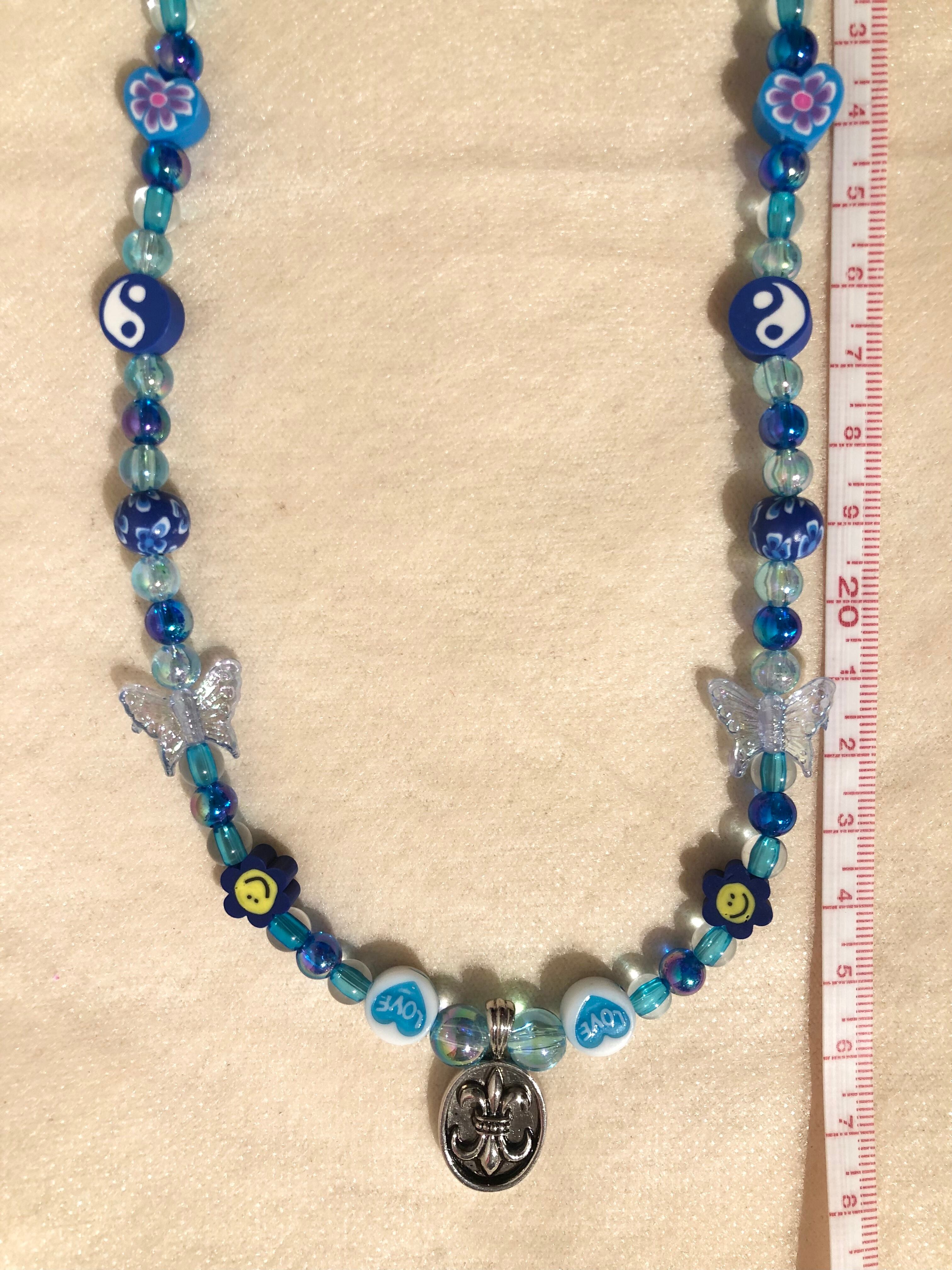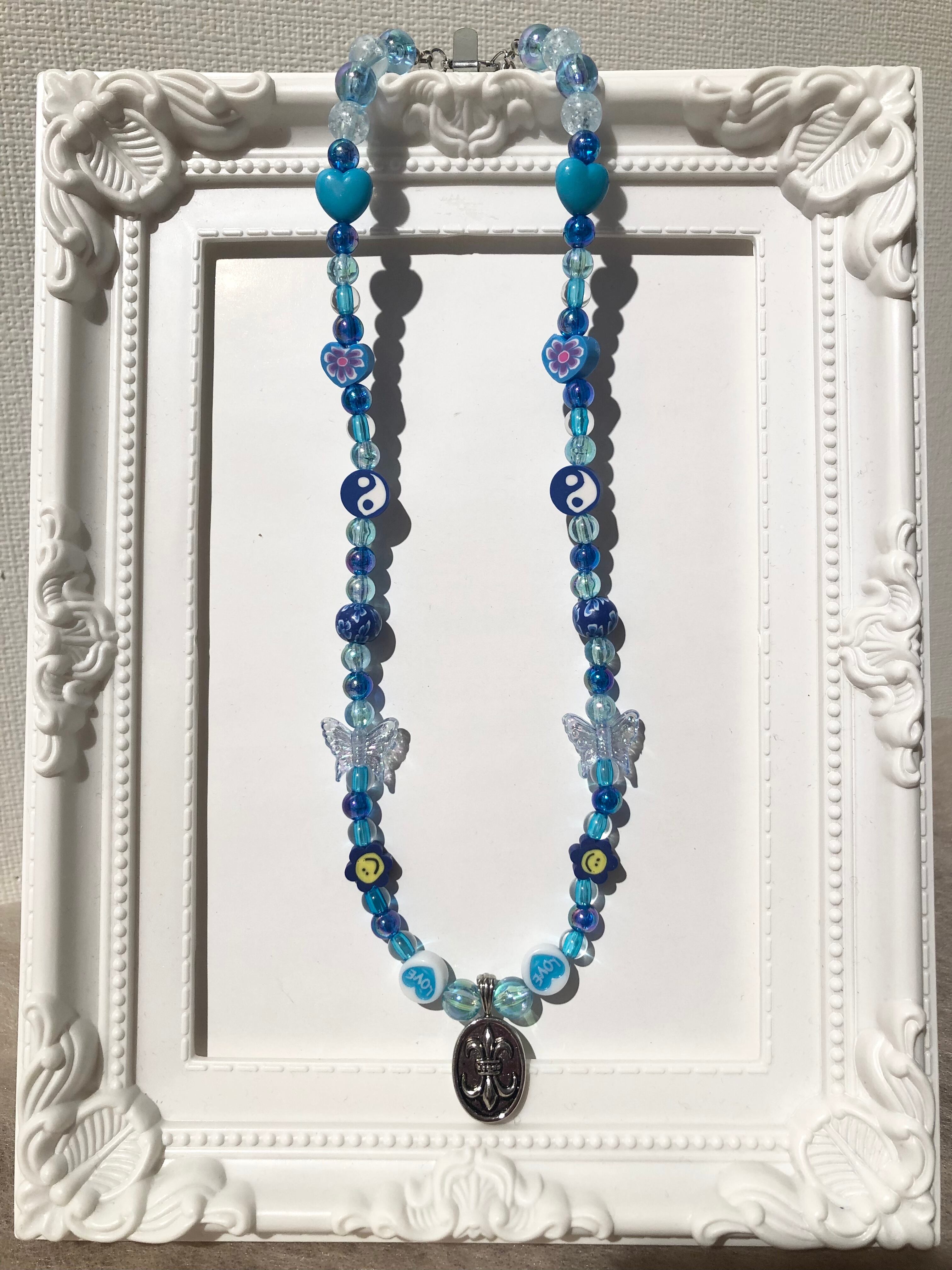 ブルービーズをベースに、ハート♡やスマイルビーズを組み合わせ、中央にチャームを付け、仕上げました!