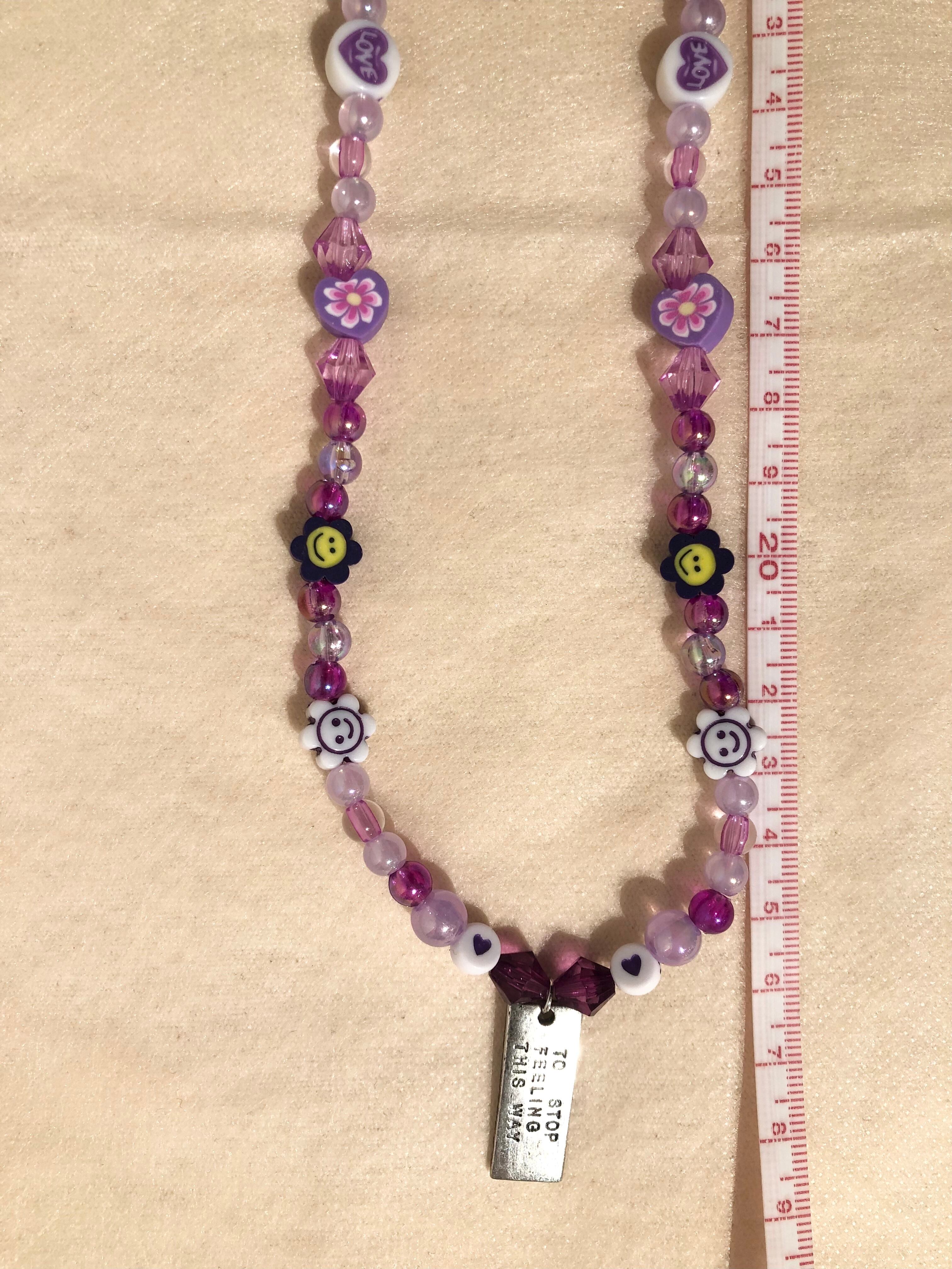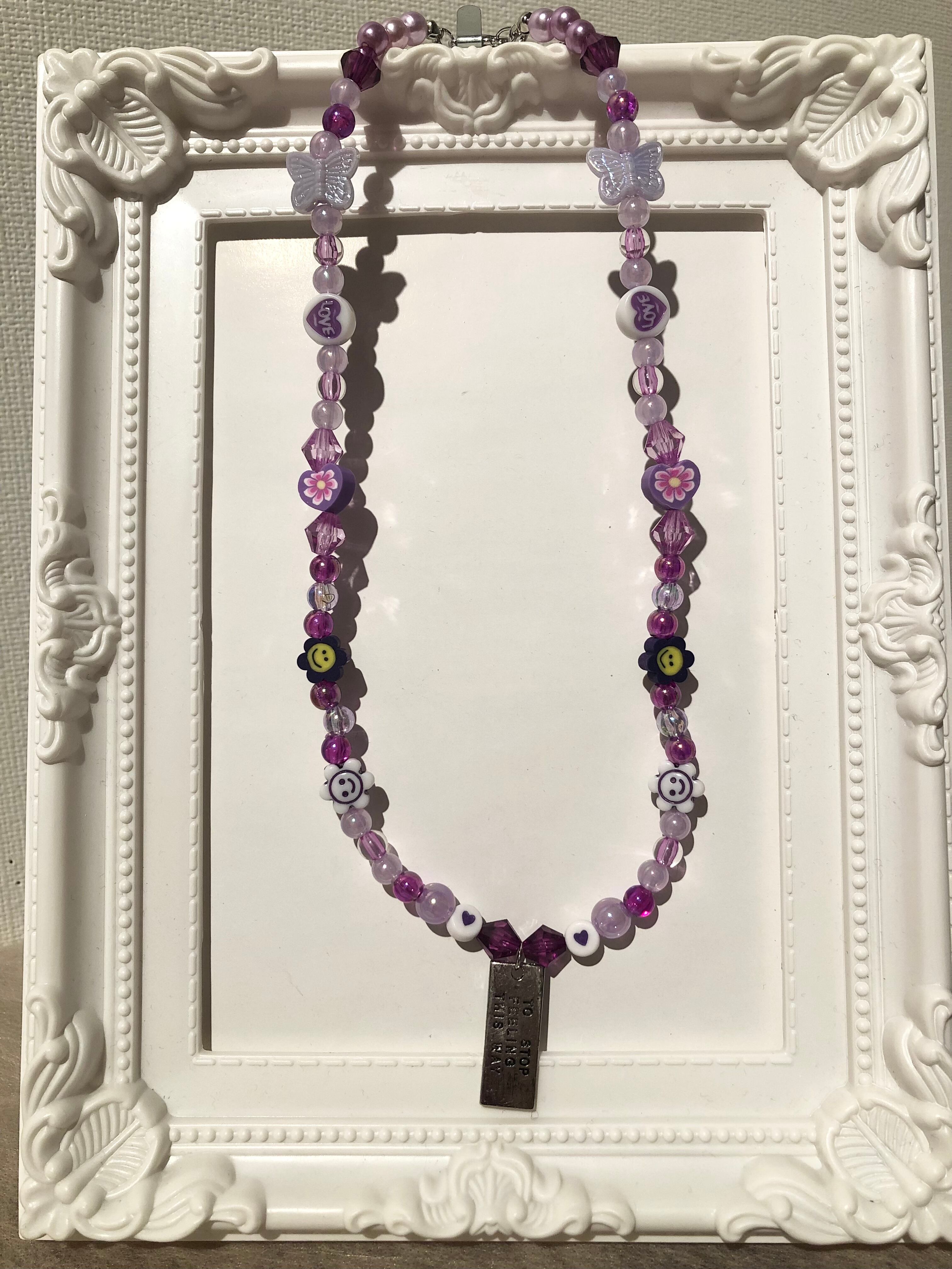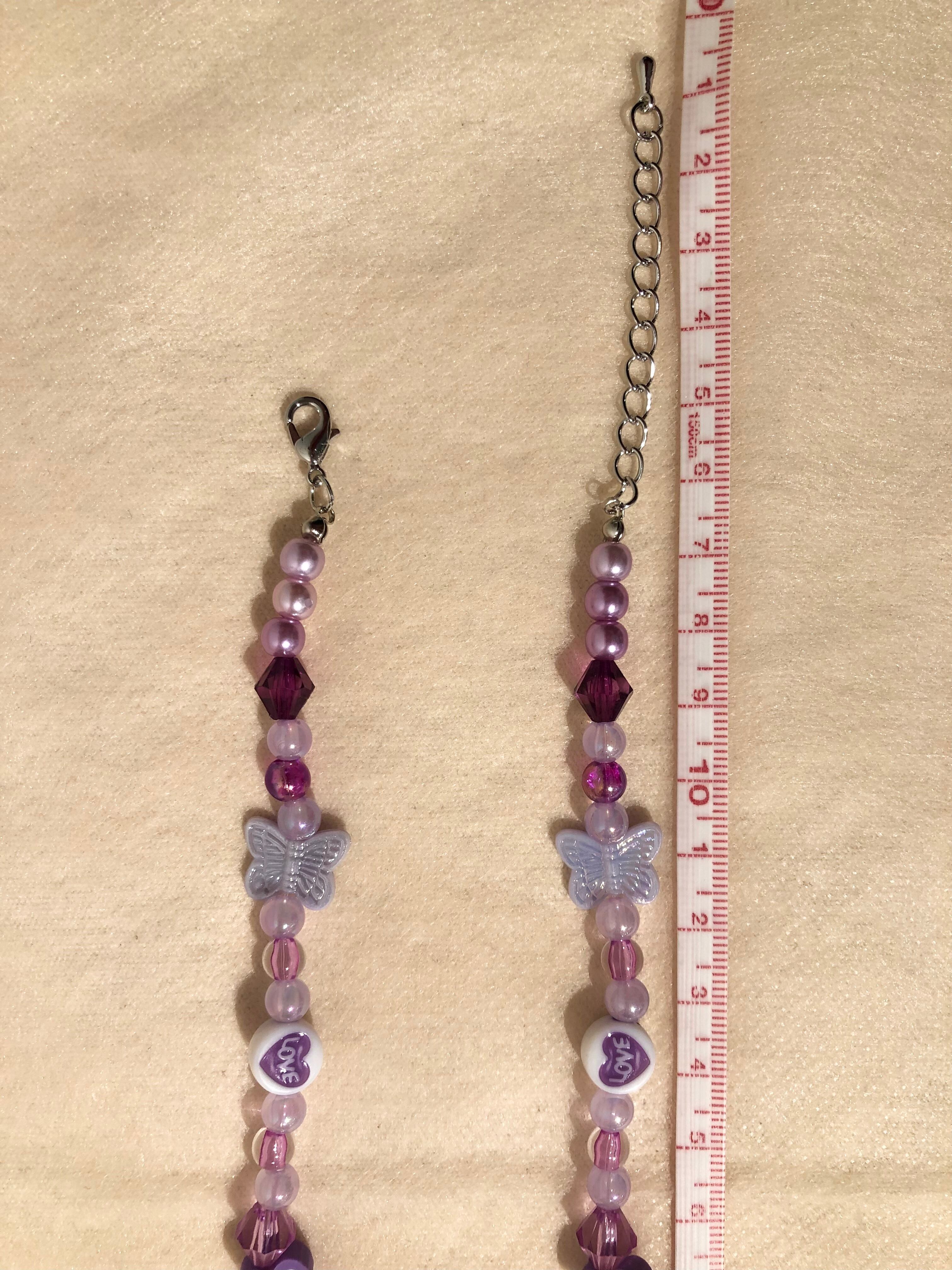 パープルビーズをベースにスマイルビーズやバタフライビーズを組み合わせ、中央にチャームを付け、仕上げました♡