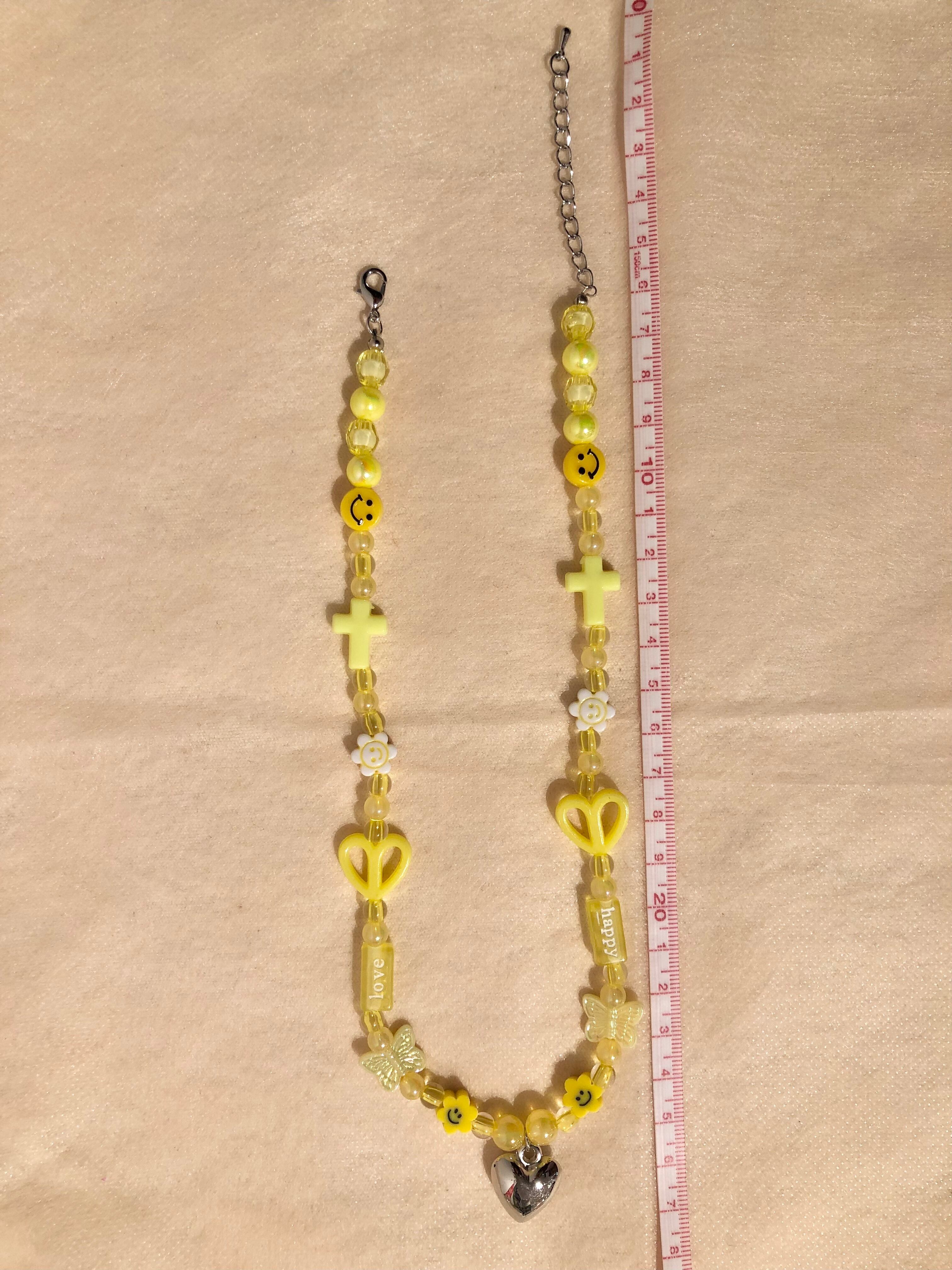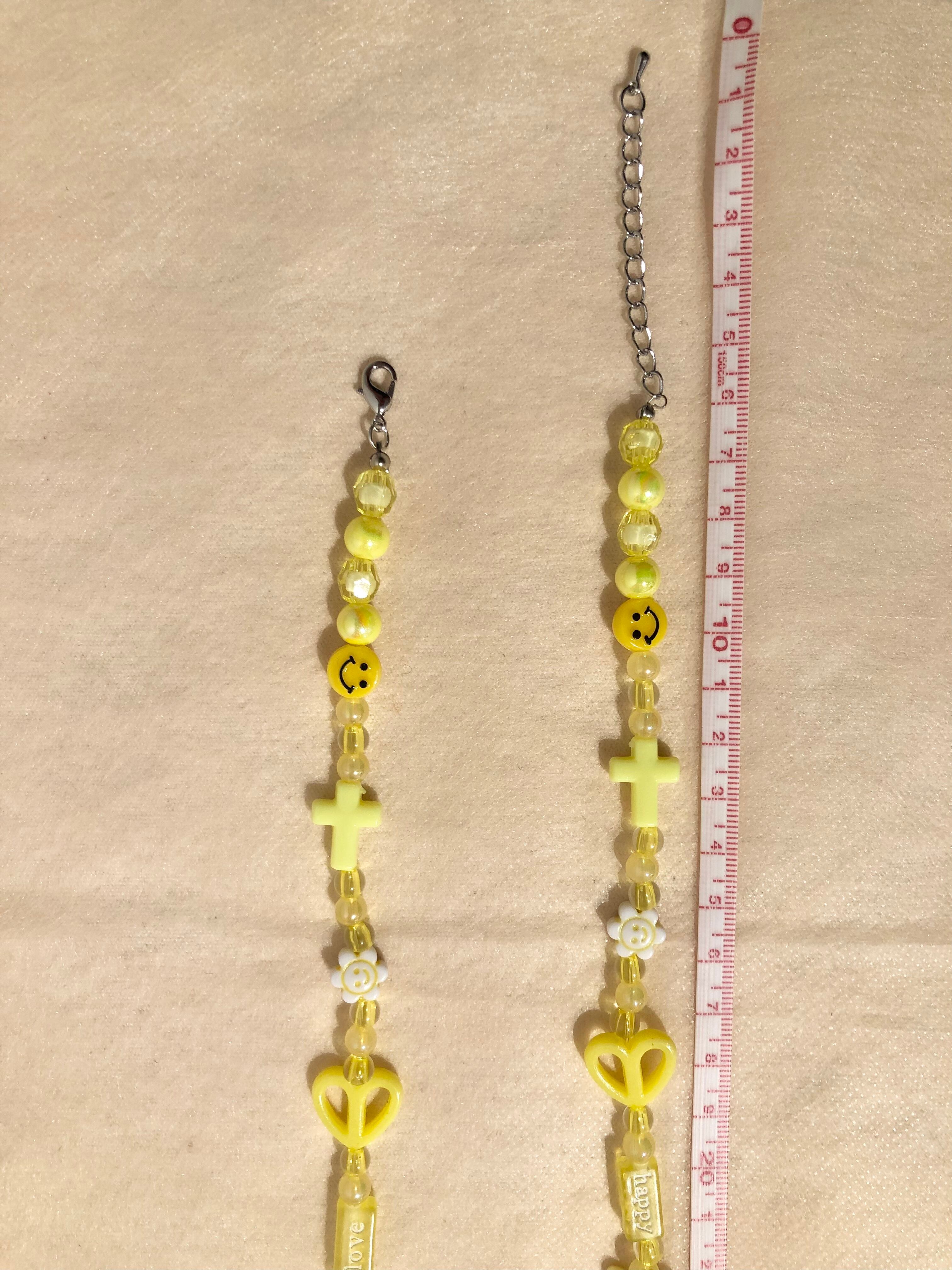 イエロービーズをベースに、スマイルビーズや文字ビーズ、バタフライビーズを組み合わせ、中央にハート♡チャームを付け、ガーリー系に仕上げました☆
