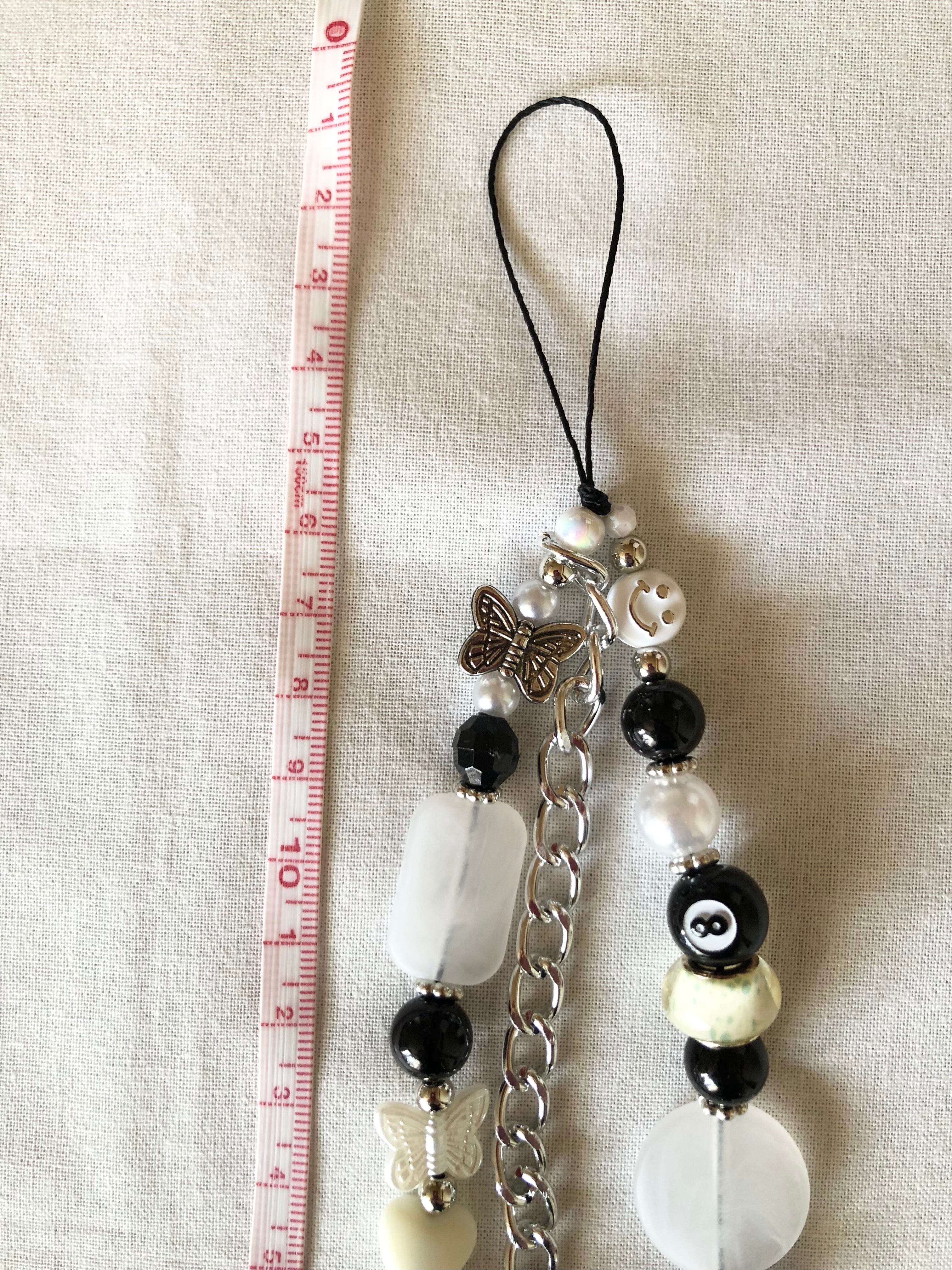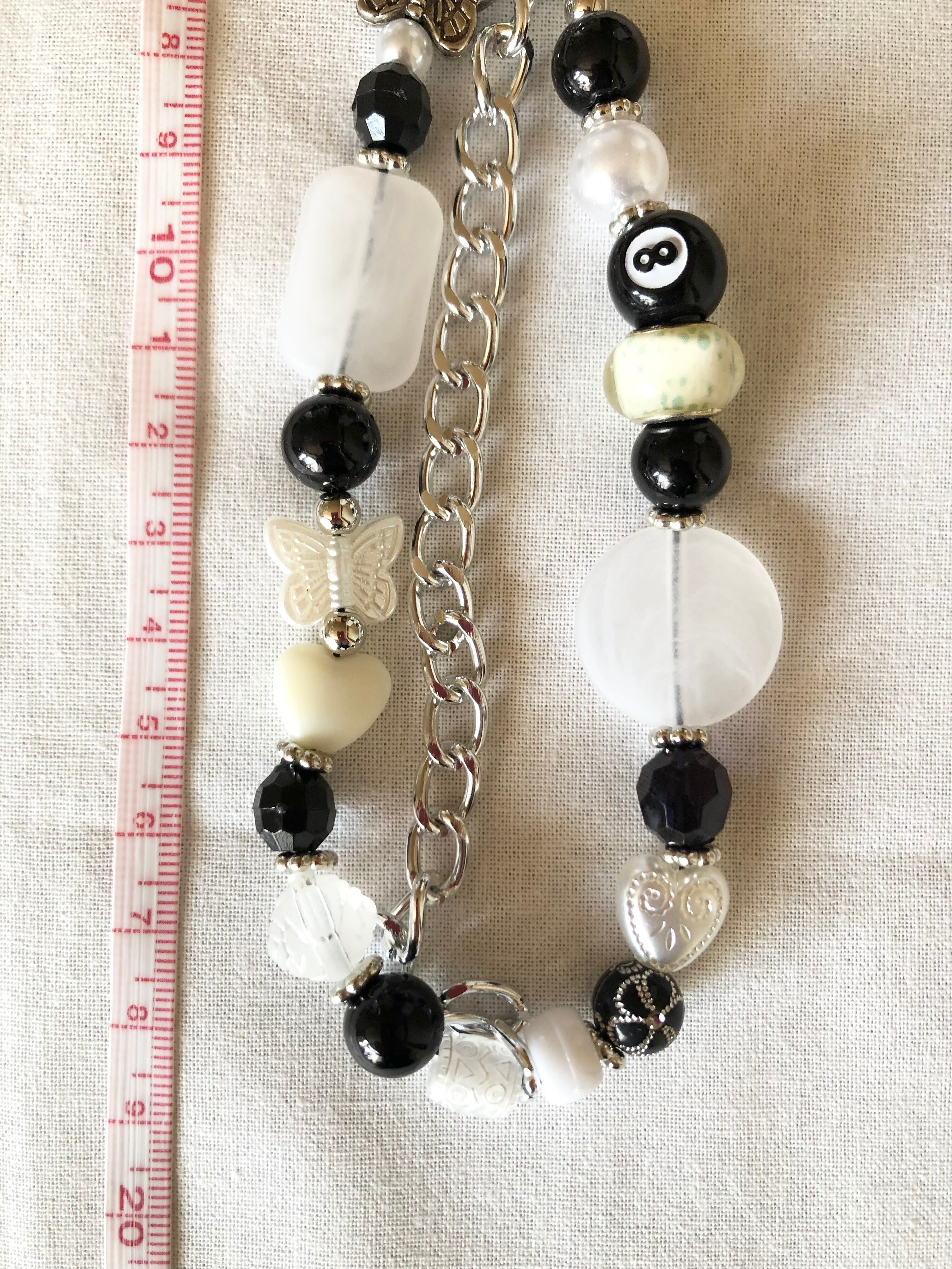 ホワイトビーズ、ブラックビーズでシックにまとめ、シルバーチェーンでゴージャス感をアップしました☆彡