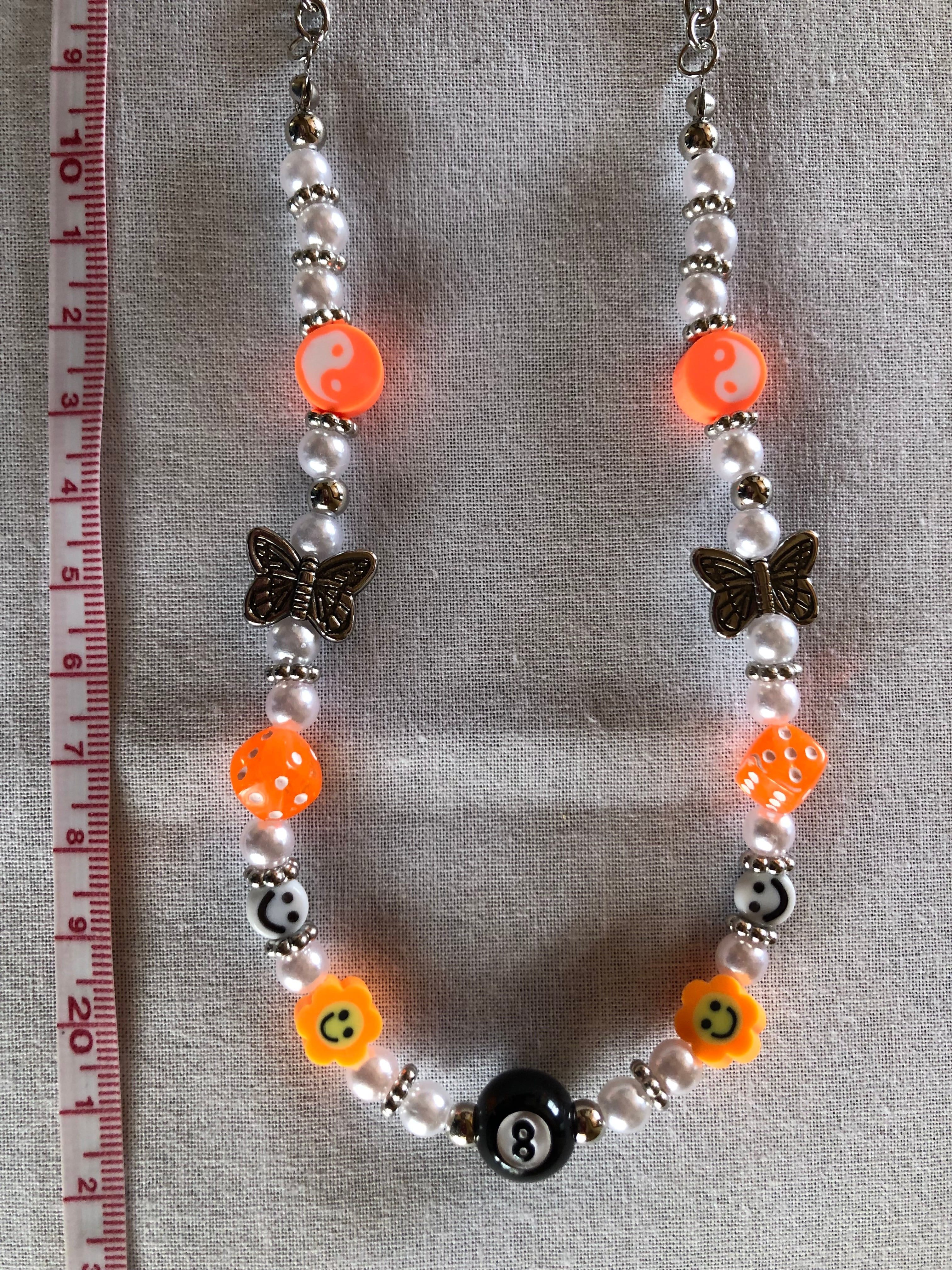 人気の陰陽パーツ、スマイルパーツ、サイコロパーツ、8番玉ビーズを組み合わせ、ロングチェーンで仕上げました☆彡