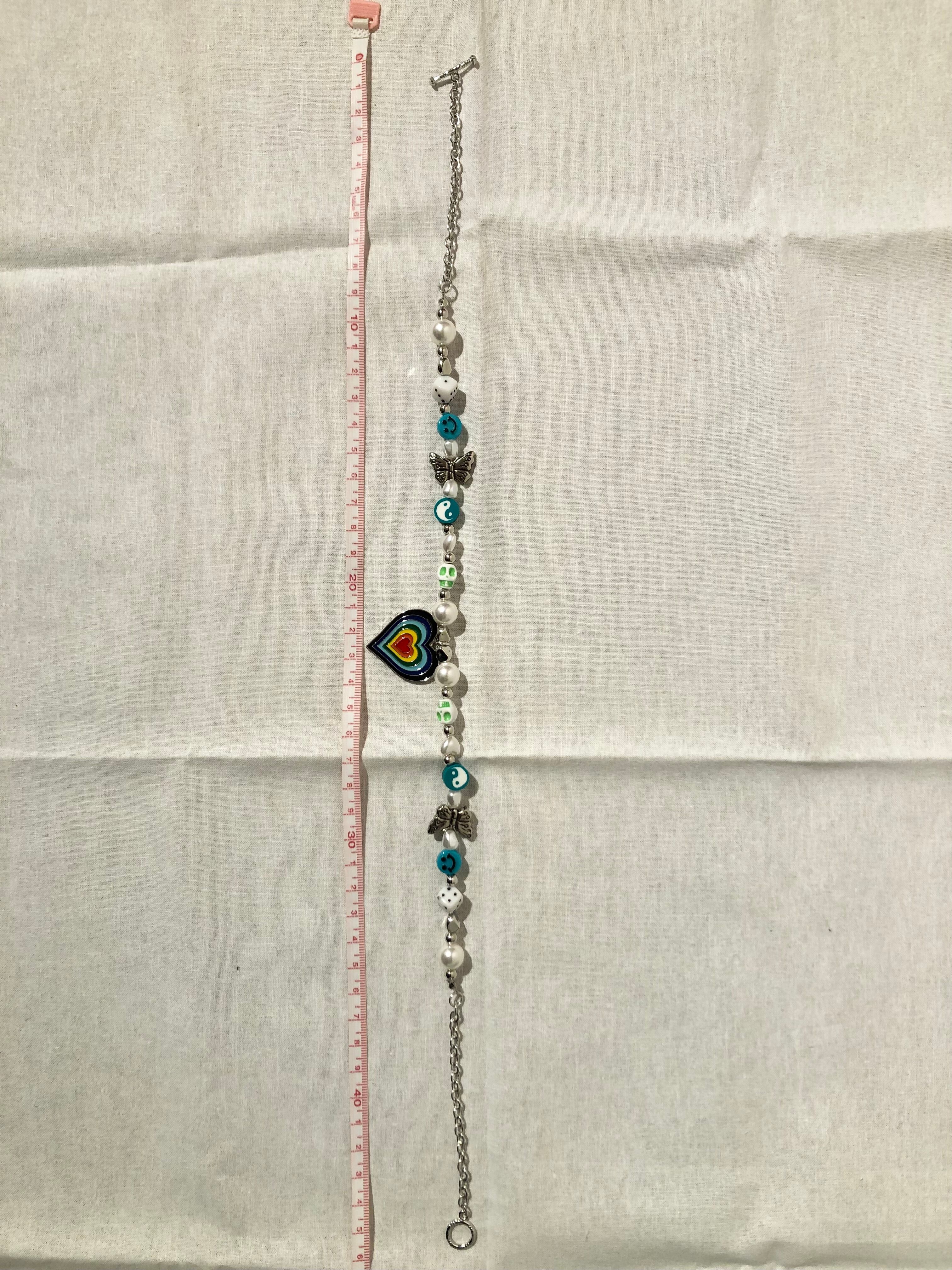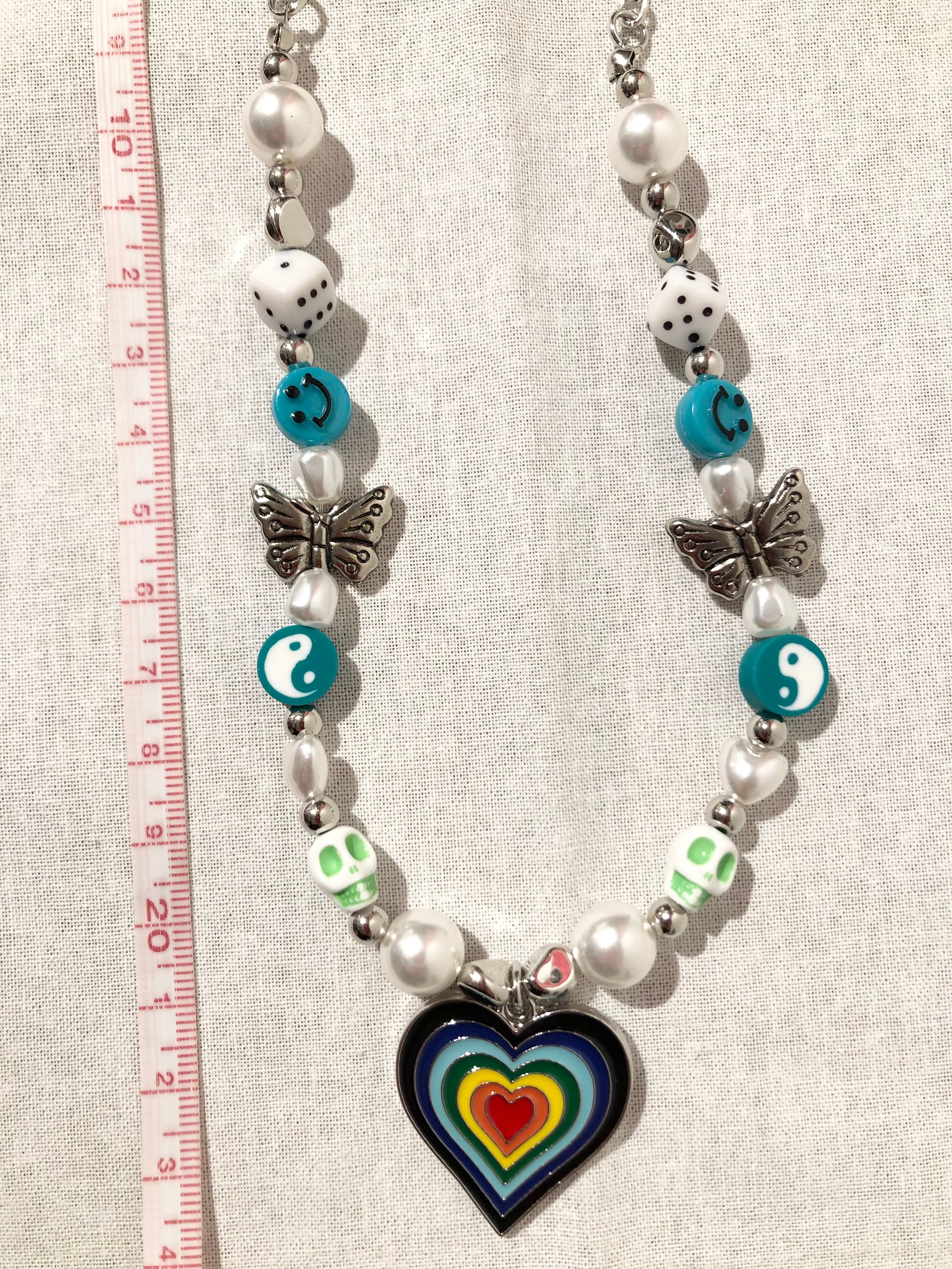 シルバーチェーンに、大きめバタフライ、陰陽パーツ、スカルパーツ、サイコロパーツ、大きめパールを組み合わせ、全体的に緑っぽい感じに仕上げました☆彡