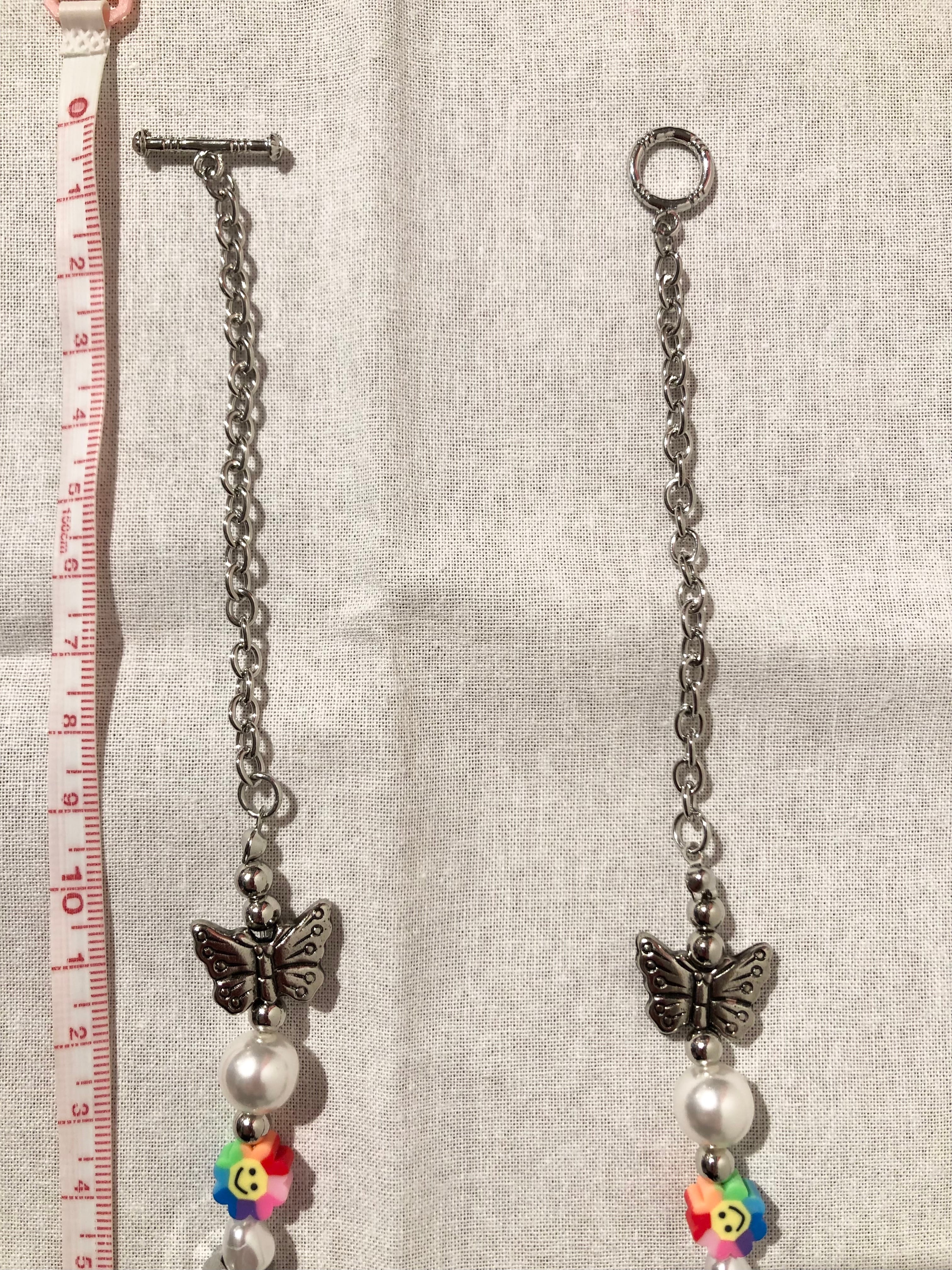 シルバーチェーンに大小のバタフライパーツ、紫スカルパーツ、大きめパールにレインボースマイルチャームを付け仕上げました☆彡