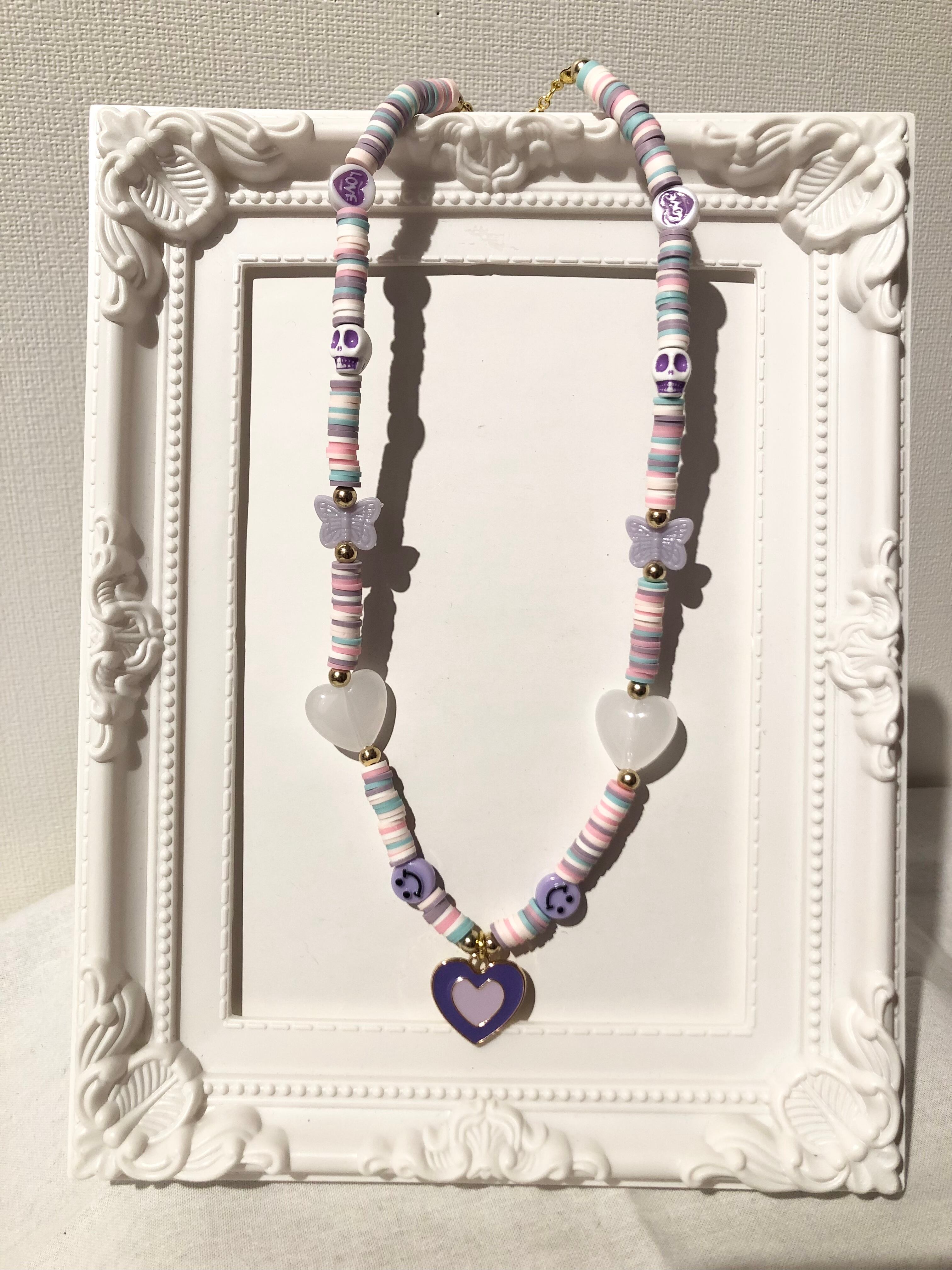 ピンク系のシリコーンビーズをメインに、スマイルパーツ、スカルパーツ、バタフライパーツ、大きなホワイトハートが特徴的で中央にピンクパープルのハートチャームで仕上げました☆彡