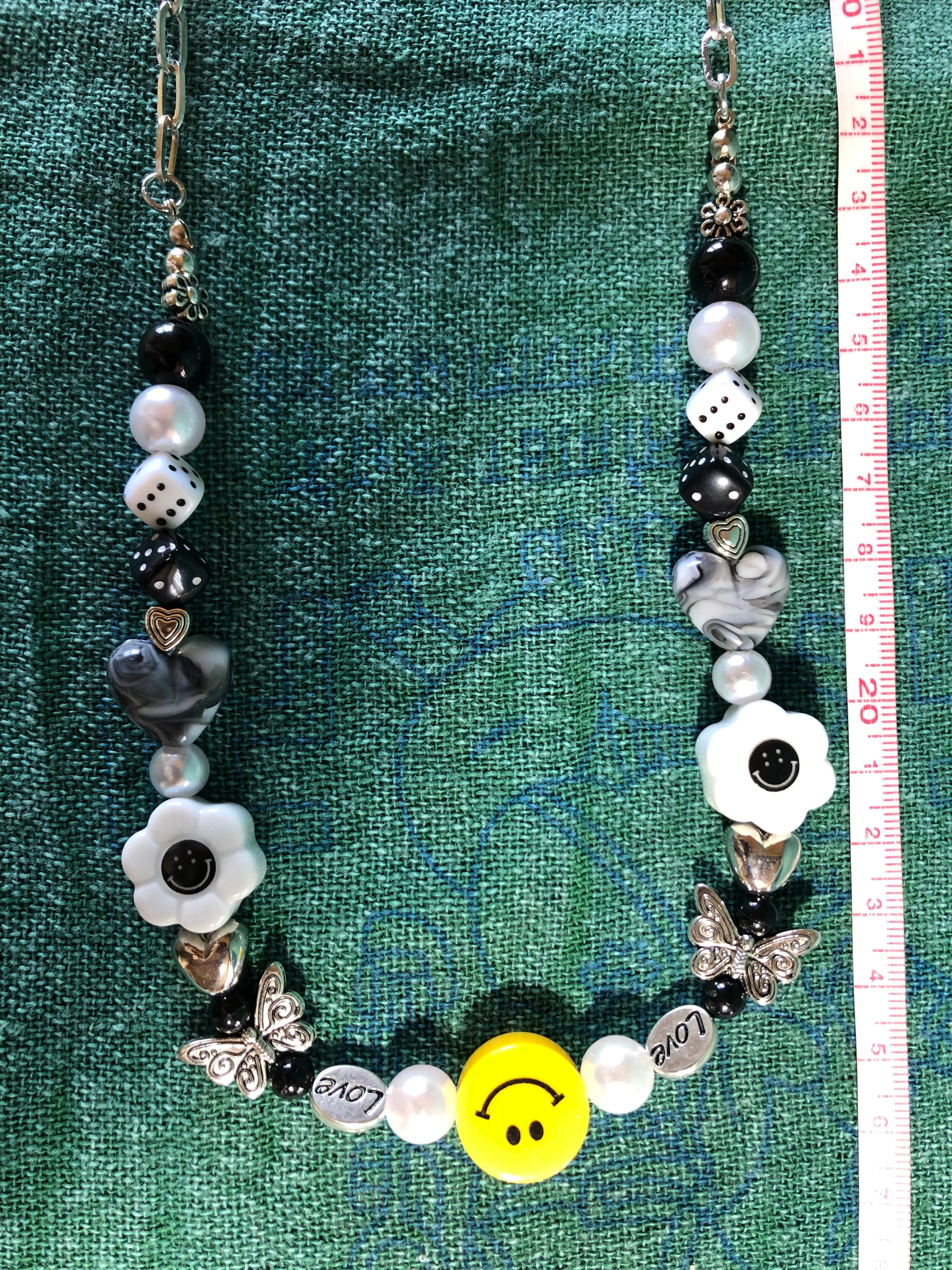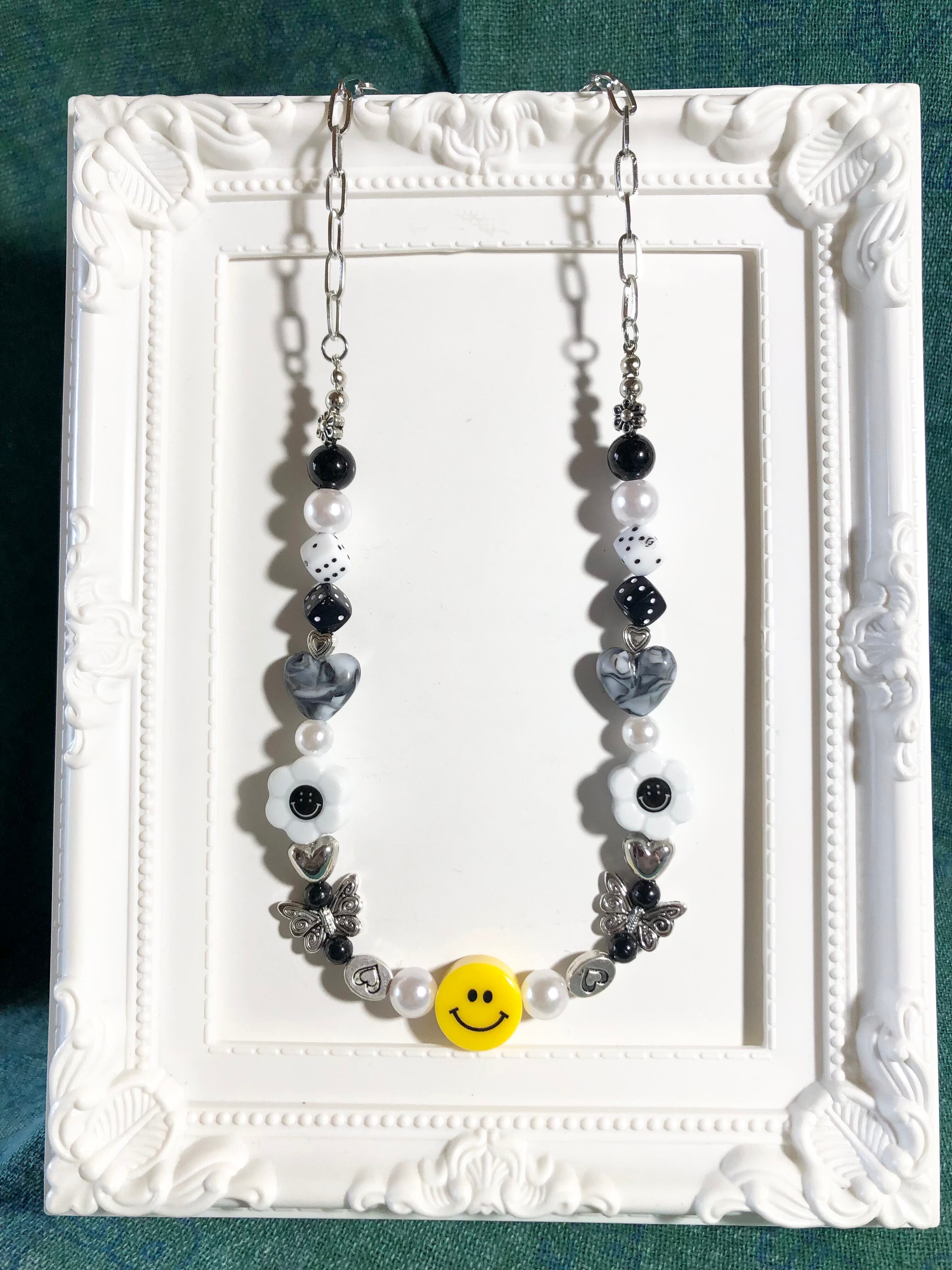 名前の通り大きなスマイルパーツが特徴的なネックレスです♡1.6㎝の陶器スマイル、中央に直径1.7㎝のスマイル、マーブルハートに1.5㎝のバタフライでストリート風に仕上げました☆彡