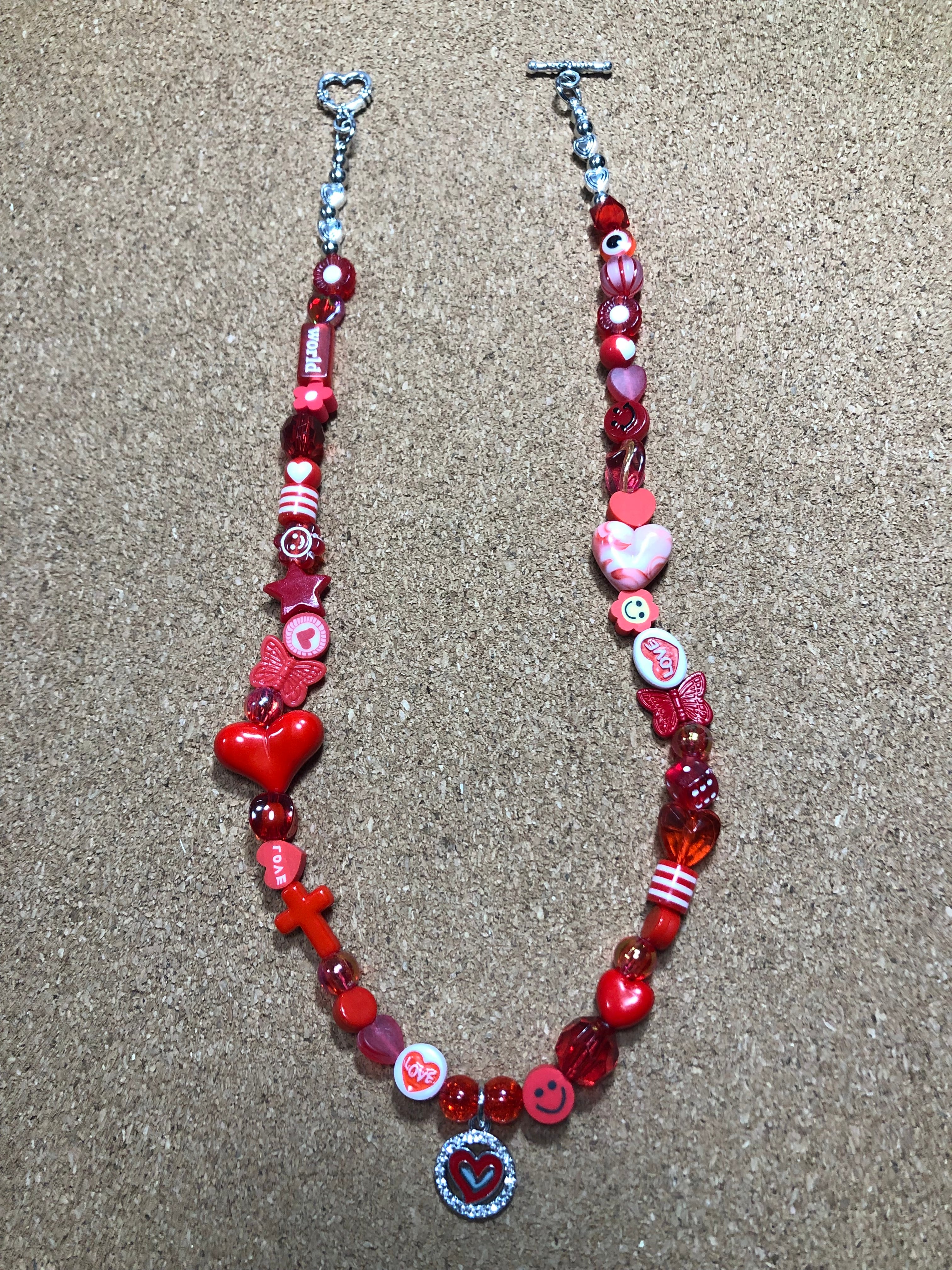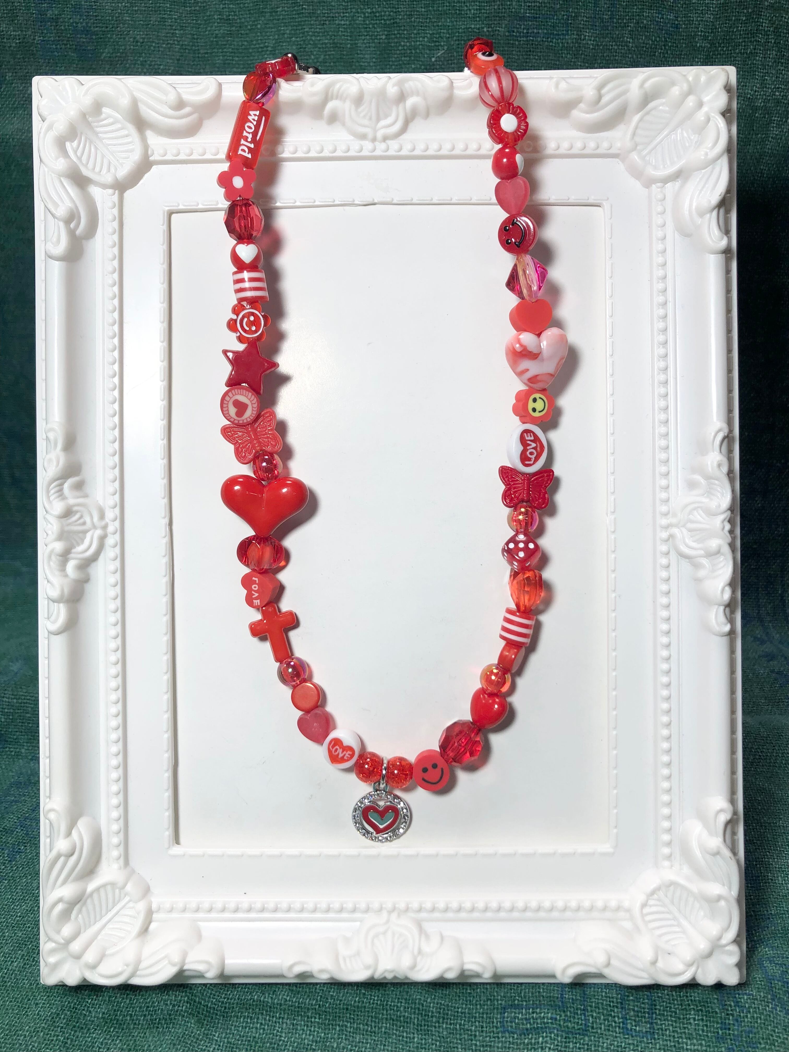 全体をレッドパーツを組み合わせ、直径2㎝の大きなハート♡中央にハート♡チャームでラブリーで可愛く仕上げました♡