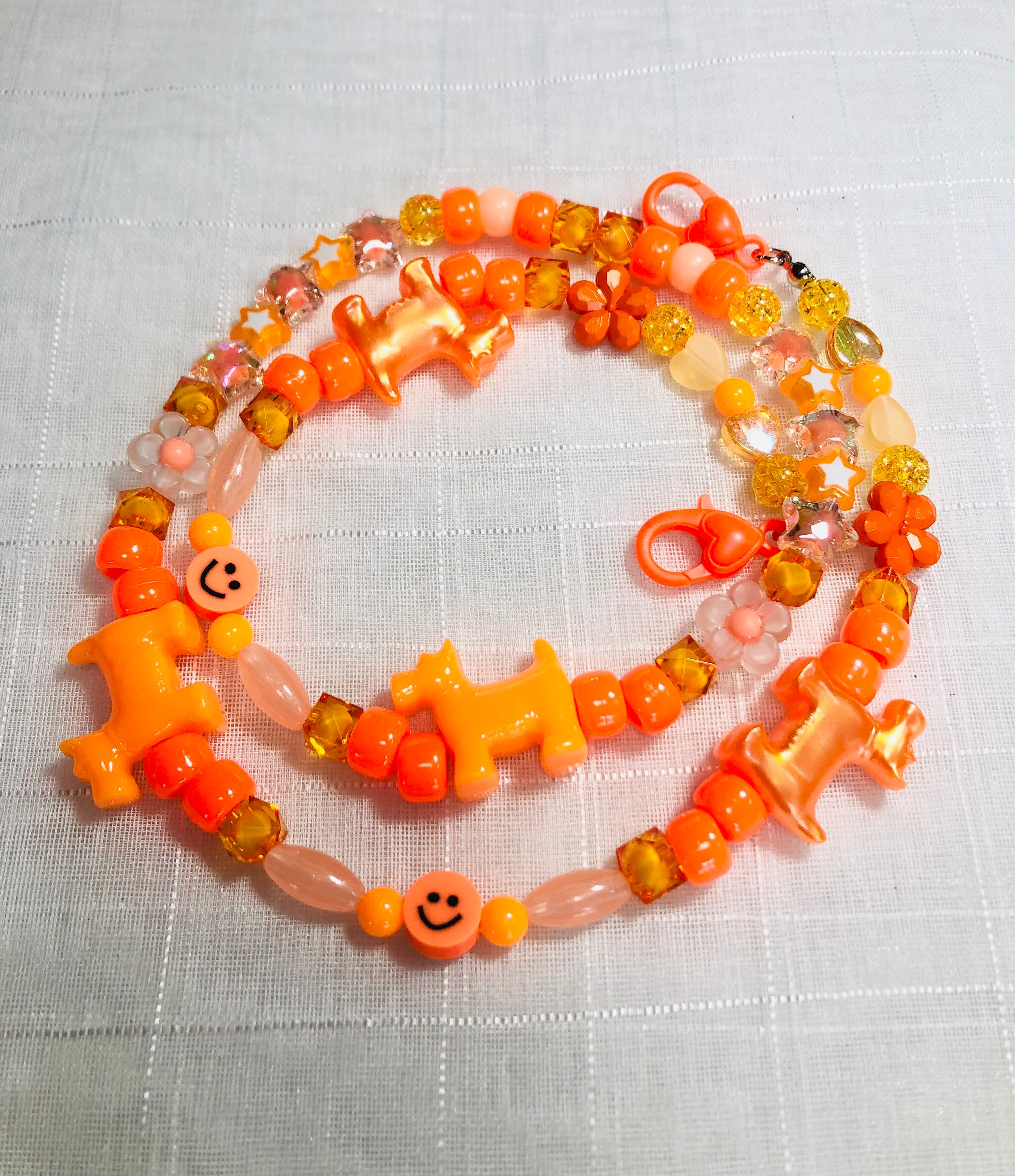 オレンジをメインにビーズを組み合わせ、直径2㎝の可愛いワンちゃんビーズを特徴にポップに仕上げました♡♪♪