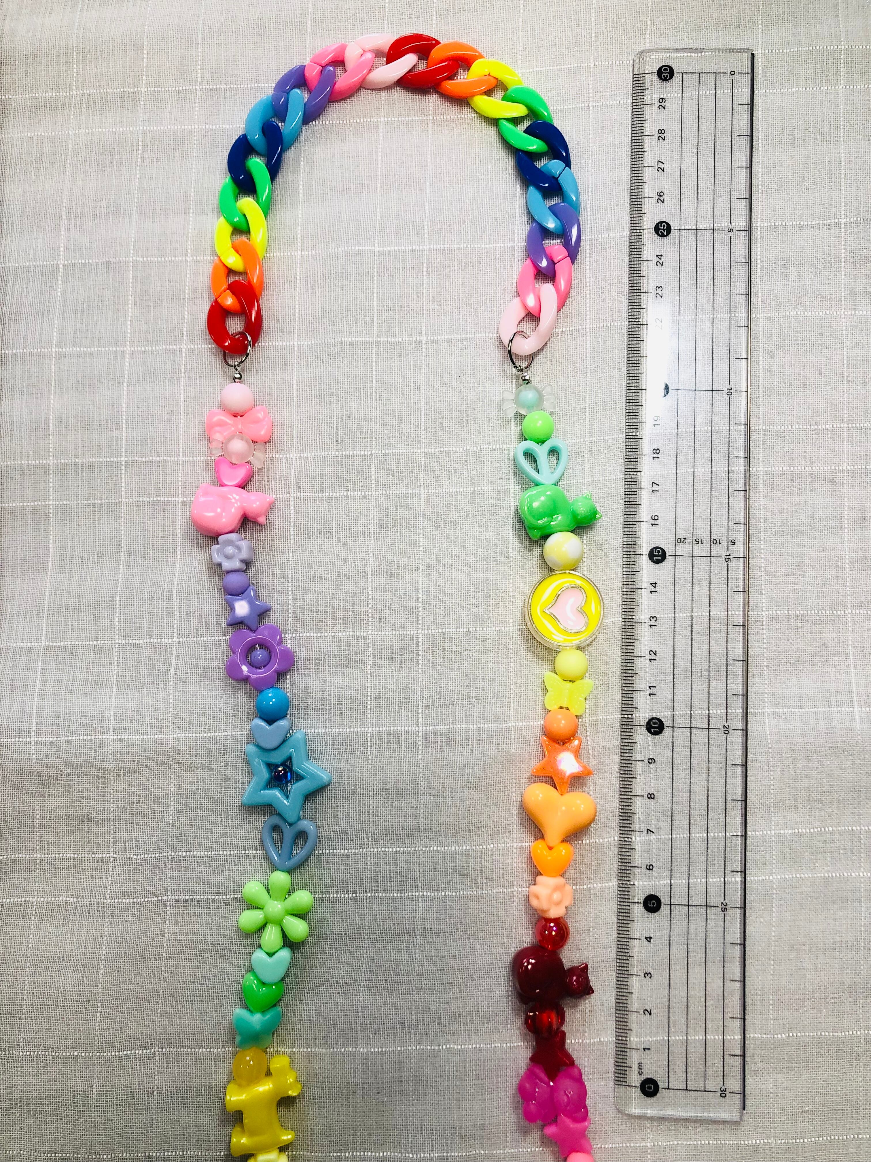 カラフルなレインボービーズとレインボーチェーンを組み合わせ、子供用肩掛けチェーンショルダーにしました♪♪